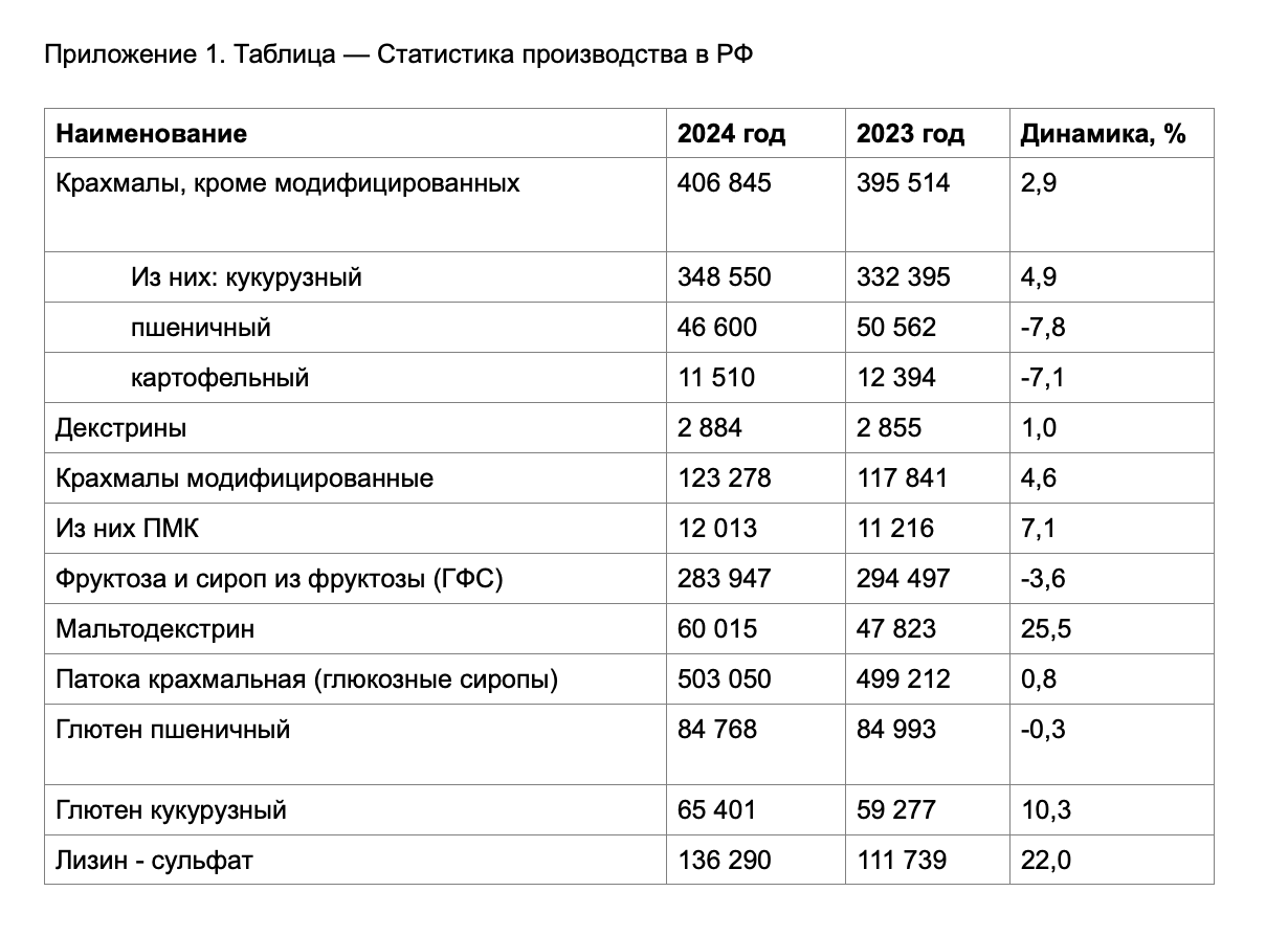 Отчет за 2024 год Ассоциации предприятий глубокой переработки зерна «Союзкрахмал» по производству в России основных видов продукции глубокой переработки зерна. В 2024 году в РФ увеличилось производство мальтодекстрина на 25,5%, пищевых модифицированных крахмалов — на 7,1%, кукурузного нативного крахмала — на 4,9% по сравнению с предшествующим годом.